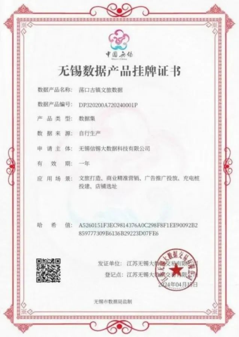 近日,由無錫錫州控股集團(tuán)旗下子公司信錫大數(shù)據(jù)開發(fā)的蕩口古鎮(zhèn)文旅數(shù)據(jù)產(chǎn)品,在無錫大數(shù)據(jù)交易公司(以下簡稱“錫數(shù)交”)成功掛牌并完成交易,成為全市首例公開掛牌并在錫數(shù)交完成場內(nèi)交易的文旅數(shù)據(jù)產(chǎn)品。