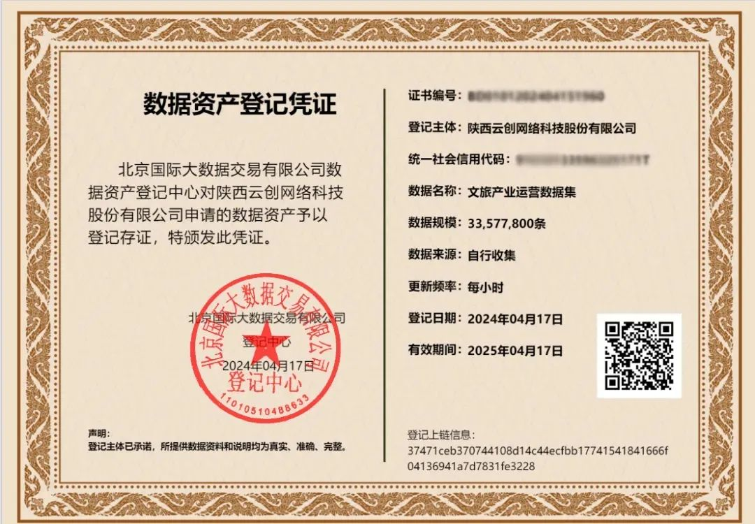 為了更好挖掘數(shù)據(jù)背后的價(jià)值,實(shí)現(xiàn)公司自有數(shù)據(jù)從資源到產(chǎn)品再到資產(chǎn)的轉(zhuǎn)化,云創(chuàng)科技成立了數(shù)據(jù)管理委員會(huì),優(yōu)化數(shù)據(jù)中心,建立數(shù)據(jù)管理規(guī)章制度,完善相關(guān)平臺(tái)信息化建設(shè),為數(shù)據(jù)資產(chǎn)入表迅速落地奠定了堅(jiān)實(shí)基礎(chǔ)。同時(shí),公司對(duì)自有數(shù)據(jù)進(jìn)行了全面梳理,篩選提純優(yōu)質(zhì)數(shù)據(jù)資源,并進(jìn)行嚴(yán)格的盤點(diǎn)清洗、加工處理,形成了標(biāo)準(zhǔn)化數(shù)據(jù)產(chǎn)品“文旅產(chǎn)業(yè)運(yùn)營數(shù)據(jù)集”。在此基礎(chǔ)上,經(jīng)北京國際大數(shù)據(jù)交易所的指導(dǎo),完成合規(guī)確權(quán)、質(zhì)量評(píng)價(jià)、成本歸集分?jǐn)?、資產(chǎn)登記等流程,讓“文旅產(chǎn)業(yè)運(yùn)營數(shù)據(jù)集”以數(shù)據(jù)資產(chǎn)形式成功入表,實(shí)現(xiàn)了公司數(shù)據(jù)資產(chǎn)化“從0到1”的突破,也為文旅行業(yè)數(shù)據(jù)治理和規(guī)范化管理、數(shù)據(jù)資產(chǎn)價(jià)值評(píng)估及入表核算提供了實(shí)踐經(jīng)驗(yàn)。